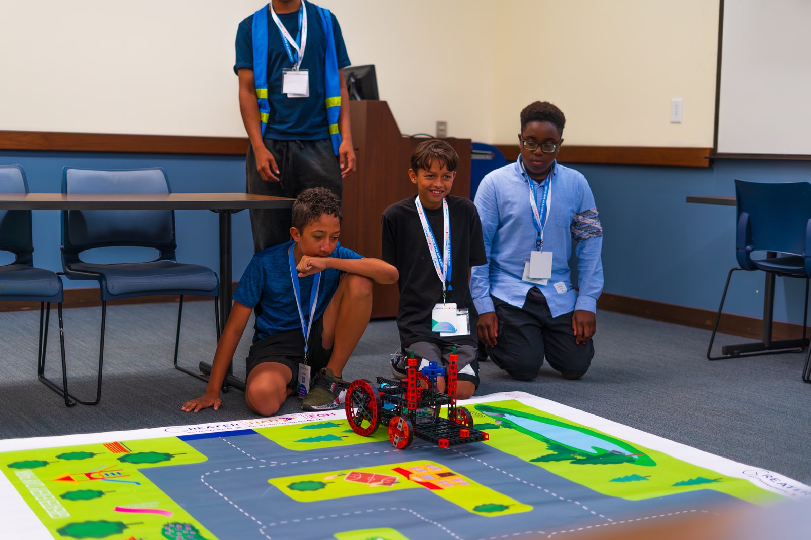 We deliver our GTT program curriculum to our community partners who already serve students from underestimated communities within the region. We developed a Community Robotics Program for schools and organizations who did not have or had little to no access to robotics. This is an 11-week afterschool program where students design, build, and code robots, while also developing a business pitch.